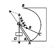 如图所示,有一质量不计的杆AO,长为R,可绕A自由转动.用绳在O点悬挂一个重为G的物体,另一根绳一端系在O点,另一端系在以O点为圆心的圆弧形墙壁上的C点.当点C由图示位置逐渐向上沿圆弧CB移动过程中(保持OA与地面夹角θ不变),OC绳所受拉力的大小变化情况是 ( )