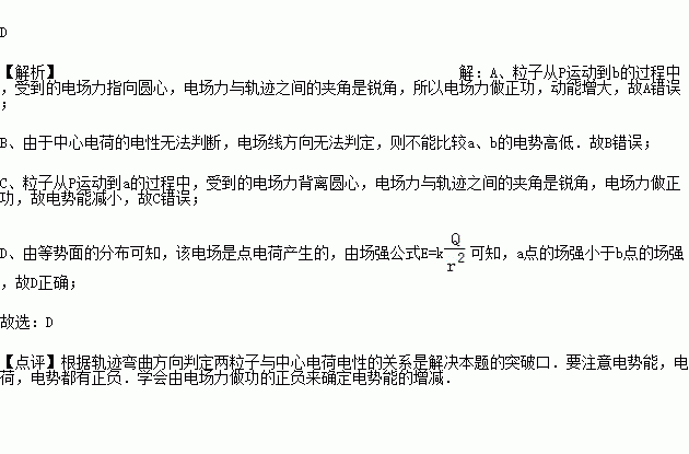 图中虚线是某电场中的一簇等势线.两个带电粒子从P点均沿等势线的切线方向射入电场,粒子运动的部分轨迹如图中实线所示.若粒子仅受电场力的作用,下列说法中正确的是( )