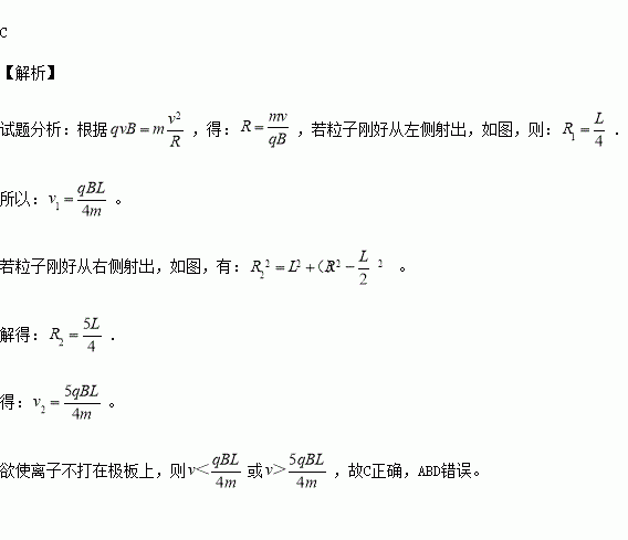 长为L,间距也为L的两平行金属板间有垂直向里的匀强磁场,如图所示,磁感应强度为B,今有质量为m、带电量为q的正离子从平行板左端两板正中间以平行于金属板的方向射入磁场。欲使离子不打在极板上,入射离子的速度大小应满足的条件是