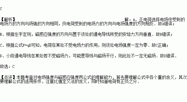 C.电荷在某处不受电场力的作用,则该处电场强度一定为零