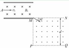 如图所示,有一对平行金属板,板间加有恒定电压;两板间有匀强磁场,磁感应强度大小为B0,方向垂直于纸面向里。金属板右下方以MN、PQ为上下边界,MP为左边界的区域内,存在垂直纸面向外的匀强磁场,磁场宽度为d,MN与下极板等高,MP与金属板右端在同一竖直线。一电荷量为q、质量为m的正离子,以初速度v0沿平行于金属板面、垂直于板间磁场的方向从A点射入金属板间,不计离子的重力。