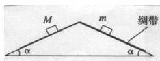 的等腰三角形斜面固定在水平面上,一足够长的轻质绸带跨过斜面的顶端铺放在斜面的两侧,绸带与斜面间无摩擦。现将质量分别为M、m(