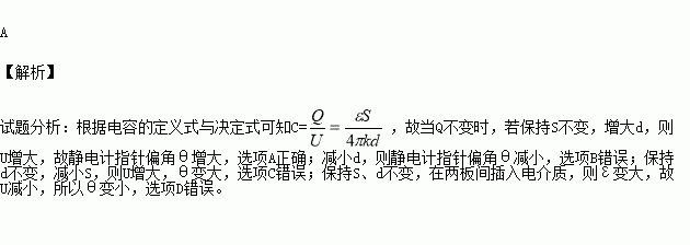 D.保持S、d不变,在两板间插入电介质,则θ变大