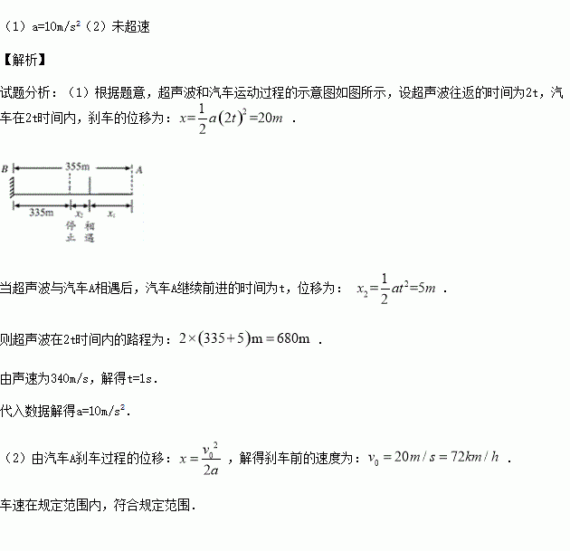如图所示,在高速公路某处安装固定雷达测速仪,可以抓拍超速车辆及测量运动车辆的加速度。若汽车距测速仪355 m时测速仪发出超声波,同时汽车由于紧急情况而急刹车,当测速仪接收到反射回来的超声波信号时,汽车恰好停止,此时汽车距测速仪335 m,已知声速为340 m/s。