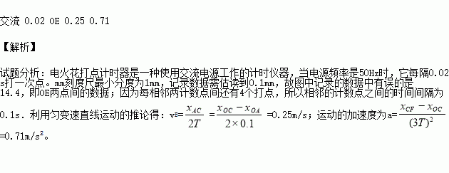 (10分,每空2分)电火花打点计时器是一种使用 电源工作的计时仪器,当电源频率是50Hz时,它每隔 s打一次点。某次实验,纸带的记录如图所示,图中O点为纸带的第一个点,接下来的前几个点模糊,因此从A点开始每打五个点取一个计数点(即图中的A、B、C、D、E、F、G是计数点),图中记录的数据中有误的是 两点间的数据,打B点时纸带的瞬时速度为vB = m/s,纸带运动的加速度为 m/s2(计算结果保留两位有效数字)。