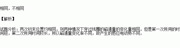 把一条形磁铁插入同一个闭合线圈中,第一次是迅速的,第二次是缓慢的,两次初末位置均相同,则在两次插入的过程中,磁通量变化量_________,产生的感应电动势为___________。(填“相同”或“不相同”)