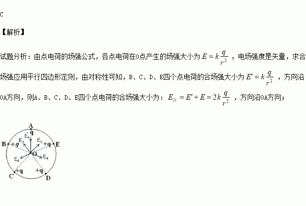 如图所示,A、B、C、D、E是半径为r的圆周上等间距的五个点,在这些点上各固定一个点电荷,除A点处的电荷量为-q外,其余各点处的电荷量均为+q,则圆心O处