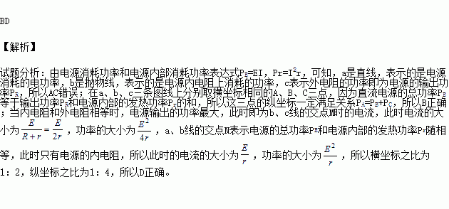 某同学将一直流电源的总功率PE、输出功率PR和电源内部的发热功率Pr随电流I变化的图线画在同一坐标系中,如右图中的a、b、c所示。则下列说法中正确的是