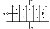 如图所示,质量为m,带电量为-q的粒子,从两平行电极板正中央垂直电场线和磁感线以速度v飞入.已知两板间距为d,磁感强度为B,这时粒子恰能直线穿过电场和磁场区域(重力不计).今将磁感强度增大到某值,则粒子将落到极板上.当粒子落到极板上时的动能为