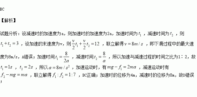 如图所示,一名消防队员在模拟演习训练中,沿着长为12m的竖立在地面上的钢管往下滑。已知这名消防队员的质量为60㎏,他从钢管顶端由静止开始先匀加速再匀减速下滑,滑到地面时速度恰好为零。如果他加速时的加速度大小是减速时的2倍,下滑的总时间为3s, g取10m/s2,那么该消防队员( )