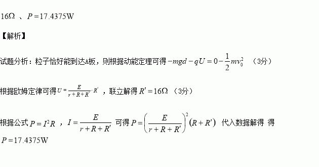 如图所示的电路中,两平行金属板A、B水平放置,两板间的距离d=20 cm。电源电动势E=24 V,内阻r=1 Ω,电阻R=15 Ω。闭合开关S,待电路稳定后,将一带正电的小球从B板小孔以初速度v0=4 m/s竖直向上射入板间。若小球带电荷量为q=1×10-2 C,质量为m=2×10-2 kg,不考虑空气阻力。那么,滑动变阻器接入电路的阻值为多大时,小球恰能到达A板?此时,电源的输出功率是多大?(g取10 m/s2)