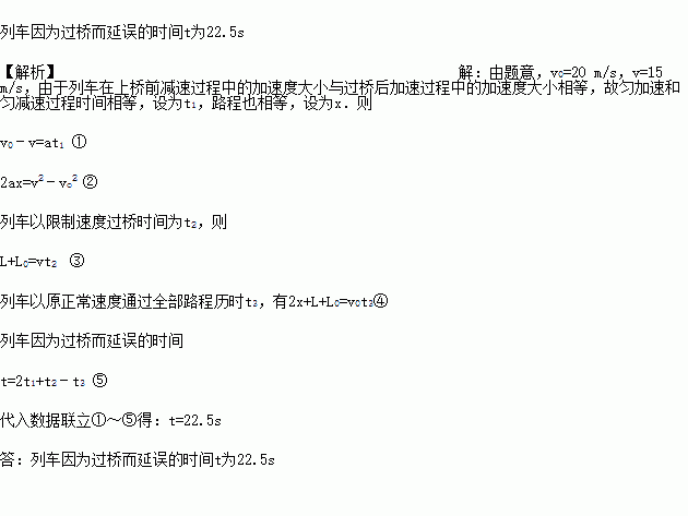 一列长L=200m的列车以v0=72 km/h的正常速度匀速运行,当它从开上长L0=1000 m的某大桥到全部车厢通过大桥,列车必须以v=54 km/h的限制速度匀速运行.已知列车在上桥前减速过程中的加速度大小与过桥后加速恢复正常速度过程中的加速度大小相等,均为a=0.5 m/s2,且列车加速和减速过程均可视为匀变速直线运动.求列车因为过桥而延误的时间t.