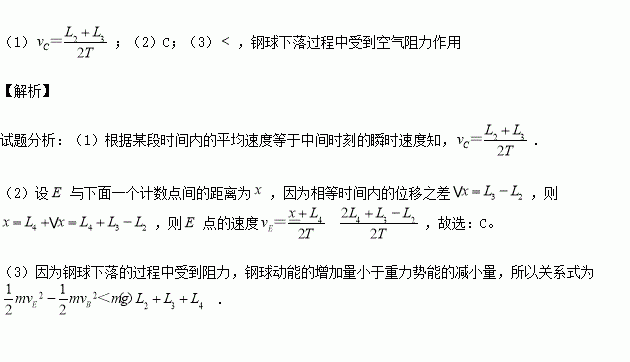 为了验证机械能守恒定律,某同学在墙壁上固定了竖直的标尺,让小钢球在标尺附近无初速释放,然后启动数码相机的连拍功能,连拍两张照片的时间间隔为T,得到了如右图所示的照片。测量出A、B、C、D、E相邻两点间的距离依次为L1、L2、L3、L4,当地重力加速度为g。