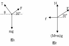 如图所示,质量M=2√3kg的木块A套在水平杆上,并用轻绳将木块:A与质量m=√3kg的小球相连。今用跟水平方向成α=30°角的力F=10√3N,拉着球带动木块一起向右匀速运动,运动中M、m相对位置不变,取g=10m/s(平方)。求: