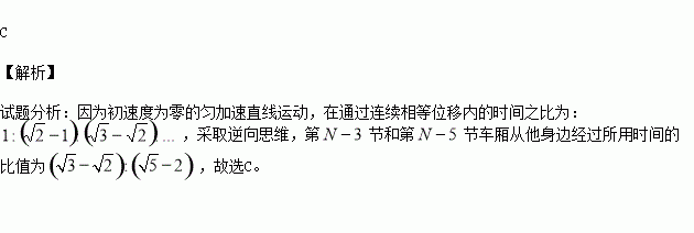 一名观察者站在站台边,火车进站从他身边经过,火车共N节车厢,当第N-1节车厢完全经过他身边时,火车刚好停下。设火车做匀减速直线运动且每节车厢长度相同,忽略车厢连接处的长度。则第N-3节和第N-5节车厢从他身边经过所用时间的比值为( )