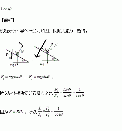在两个倾角都是θ的光滑斜面上分别放置两个导体棒,棒内分别通有电流I1和I2,两处匀强磁场的磁感应强度B的大小相同,但方向不同,一个垂直于水平面,另一个垂直于斜面(如图所示),当两导体棒都保持平衡时,求I1与I2的比值.