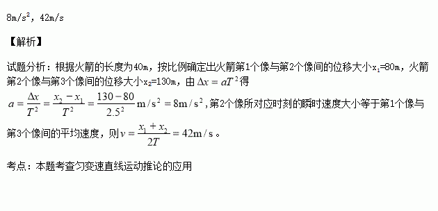 2004年7月25日,中国用长征运载火箭成功的发射了“探测二号”卫星。右图是某监测系统每隔2.5s拍摄的,关于起始加速阶段火箭的一组照片。已知火箭的长度为40m,用刻度尺测量照片上的长度关系,结果如图所示。火箭的加速度a = ,火箭在照片中第2个像所对应时刻的瞬时速度大小v = 。