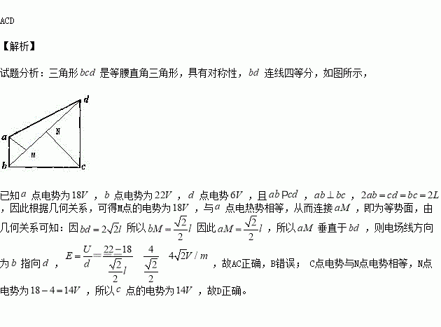 ,电场线与四边形所在平面平行.已知a点电势为18V,b点电势为22V,d点电势为6V.则下列说法正确的是( )