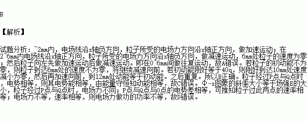 有一静电场,其电势沿x轴正方向周期性变化,如图所示。现将一电荷量为q,带负电的粒子(重力不计)从坐标原点O由静止释放,电场中P、Q两点的坐标分别为1mm、4mm。则下列说法正确的是