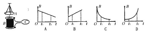 如图所示,B是一个螺线管,C是与螺线管相连接的金属线圈.在B的正上方用绝缘丝线悬挂一个金属圆环A,A的环面水平且与螺线管的横截面平行。若仅在金属线圈C所处的空间加上与C环面垂直的变化磁场,发现在t1至t2时间段内绝缘丝线的拉力变小,则金属线圈C处所加磁场的磁感应强度随时间变化的B-t图象可能是( )