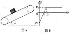 已知一足够长的传送带与水平面的倾角为θ,以一定的速度匀速运动。某时刻在传送带适当的位置放上具有一定初速度的物块(如图a所示),以此时为t=0时刻纪录了小物块之后在传送带上运动的速度随时间的变化关系,如图b所示(图中取沿斜面向上的运动方向为正方向,其中两坐标大小v1> v2)。已知传送带的速度保持不变,g取10m/s2。则下列判断正确的是( )