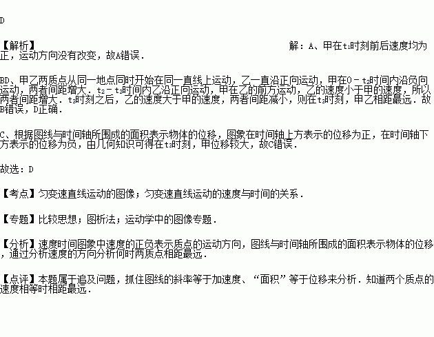 A.甲在t1时刻改变运动方向 B.在t2时刻,甲乙相距最远