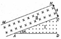 如图所示,在I、II两个区域内存在磁感应强度均为B的匀强磁场,磁场方向分别垂直于纸面向 外和向里,AD、AC边界的夹角∠DAC=300,边界AC与 边界MN平行,II区域宽度为d。质量为m、电荷量为十q的粒子可在边界AD上的不同点射人,入射速度垂直AD且垂直磁场,若入射速度大小为