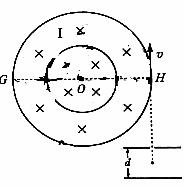 如图所示,直径分别为D和2D的同心圆处于同一竖直面内,O为圆心,GH为大圆的水平直径。两圆之间的环形区域(Ⅰ区)和小圆内部(Ⅱ区)均存在垂直圆面向里的匀强磁场。间距为d的两平行金属极板间有一匀强电场,上极板开有一小孔。一质量为m,电量为+q的粒子由小孔下方d/2处静止释放,加速后粒子以竖直向上的速度v射出电场,由点紧靠大圆内侧射入磁场。不计粒子的重力。