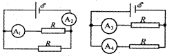如图所示的两种电路中,电源相同,各电阻阻值相等,各电流表的内阻相等且不可忽略不计.电流表A1、A2、A3、A4读出的电流值分别为I1、I2、I3、I4,下列关系式中正确的是 ( )