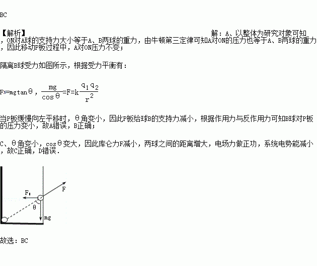 如图所示,MON为固定的“L”形直角光滑绝缘板,ON置于水平地面上,P为一可移动的光滑绝缘竖直平板.现有两个带正电小球A、B,小球A置于“L”形板的直角处,小球B靠在P板上且处于静止状态,小球A、B位于同一竖直平面内,若将P板缓慢向左平移,则下列说法正确的是( )