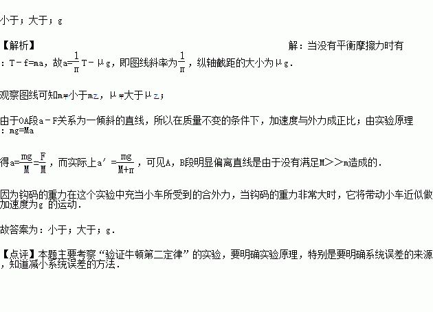 验证牛顿第二定律实验中,甲、乙两同学在同一实验室,各取一套如图所示的装置放在水平桌面上,小车上均不放砝码,在没有平衡摩擦力的情况下,研究加速度a与拉力F的关系,分别得到图中甲、乙两条直线.设甲、乙用的小车质量分别为m甲、m乙,甲、乙用的小车与木板间的动摩擦因数分别为μ甲,μ乙,由图可知,m甲 m乙、μ甲 μ乙.(选填“大于”、“小于”或“等于”).