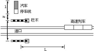 上海到南京的列车已迎来第五次大提速,速度达到v1=180km/h.为确保安全,在铁路与公路交叉的道口处需装有自动信号灯.当列车还有一段距离才到达公路道口时,道口应亮出红灯,警告未越过停车线的汽车迅速制动,已越过停车线的汽车赶快通过.如果汽车通过道口的速度v2=36km/h,停车线至道口栏木的距离x0=5m,道口宽度x=26m,汽车长l=15m(如图所示),并把火车和汽车的运动都看成匀速直线运动.问:列车离道口的距离L为多少时亮红灯,才能确保已越过停车线的汽车安全驶过道口?