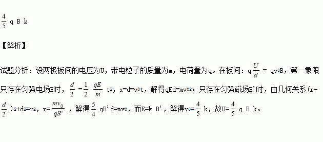 =d),若在第一象限只存在垂直于纸面的匀强磁场时,粒子也刚好通过M点,已知该电场强度和磁感应强度的比值为k,求:平行板电容器两极板间的电压为多少?