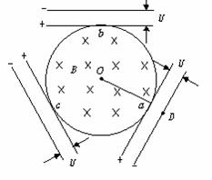 如图所示,有一半径为r的圆形有界匀强磁场区域,磁感应强度为B,方向垂直纸面向里,其周围对称放置带有中心孔a、b、c的三个相同的平行板电容器,三个电容器两板间距离均为d,接有相同的电压U,在D处有一静止的电子,质量为m,电荷量为e,释放后从a孔射入匀强磁场中,并先后穿过b、c孔再从a孔穿出回到D处,求: