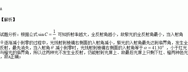 ,一束白光以较大的入射角从棱镜的左侧面射入,在光屏上形成从红到紫排列的彩色光带,各色光在棱镜中的折射率和临界角见表.当入射角逐渐减小到0