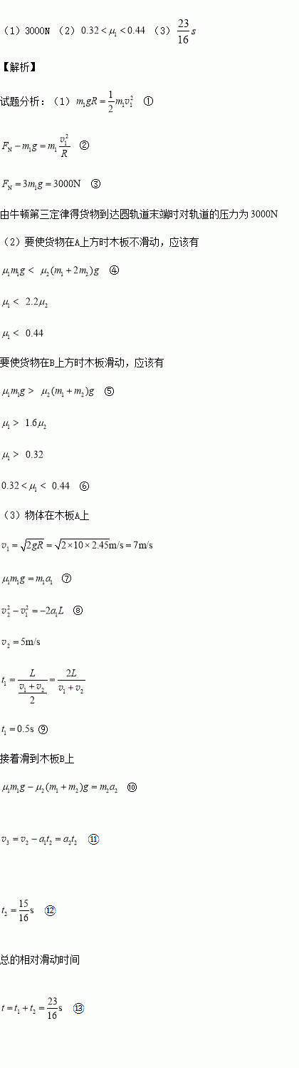 (20分)如图所示,某工厂需将质量ml=l00kg的货物(可视为质点)从高处运送至地面,为避免货物与地面发生撞击,现利用固定于地面的光滑四分之一圆轨道,使货物由轨道顶端无初速度滑下,轨道半径R=2.45m。地而上紧靠轨道依次排放两块完全相同的木板A、B,长度均为L=3m,质量均为m2=60kg,木板上表面与轨道末端相切。货物与木板间的动摩擦因数为
