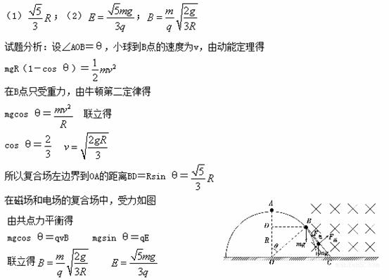 如图所示,半径为R的半圆型光滑绝缘轨道固定在水平面上,一带电量为+q,质量为m的小球以极微小的速度从轨道最高点A释放,恰在B点进入有界电场和磁场的复合场(电场未画出),并能沿直线运动到地面上的C点。(重力加速度为g)求: