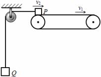 如右上图所示,水平传送带以速度v1匀速运动,小物体P、Q由通过定滑轮且不可伸长的轻绳相连,t = 0时刻P在传送带左端具有速度v2,已知v1>v2,P与定滑轮间的绳水平。不计定滑轮质量,绳足够长。直到物体P从传送带右侧离开。以下判断正确的是( )