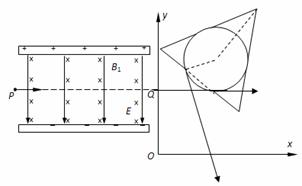 如图所示的平行板器件中,存在相互垂直的匀强磁场和匀强电场,磁场的磁感应强度B1 = 0.40 T,方向垂直纸面向里,电场强度E = 2.0×105 V/m,PQ为板间中线.紧靠平行板右侧边缘xOy坐标系的第一象限内,有垂直纸面的正三角形匀强磁场区域(图中未画出),磁感应强度B2 = 0.25 T。一束带电量q = 8.0×10-19 C,质量m = 8.0×10-26 kg的正离子从P点射入平行板间,不计重力,沿中线PQ做直线运动,穿出平行板后从y轴上坐标为(0,0.2m)的Q点垂直y轴射向三角形磁场区,离子通过x轴时的速度方向与x轴正方向夹角为60°。则: