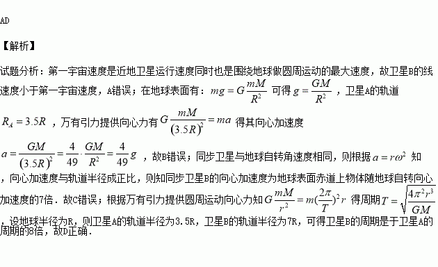 现在,人造地球卫星发挥着越来越重要的作用。马航MH370航班与地面失去联系的一年多时间里,我国共调动了21颗卫星为搜救行动提供技术支持。假设某颗做匀速圆周运动的卫星A,其轨道在赤道平面内,距离地面的高度为地球半径的2.5倍,取同步卫星B离地面高度为地球半径的6倍,则