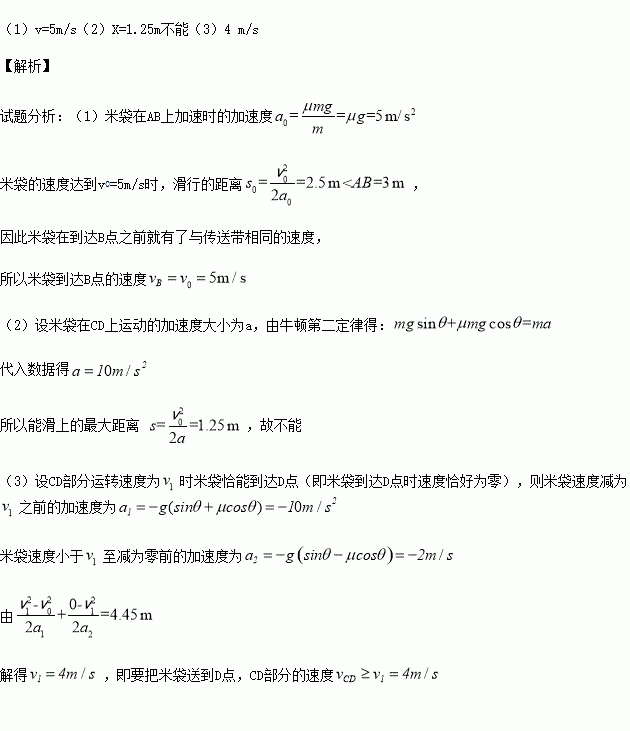 £¬C¡¢DÁ½¶ËÏà¾à4.45m£¬B¡¢CÏà¾àºÜ½ü¡£Ë®Æ½²¿·ÖABÒÔv0=5m/sµÄËÙÂÊ˳ʱÕëת¶¯¡£½«Ò»´üÖÊÁ¿Îª10kgµÄ´óÃ×ÎÞ³õËÙ¶È·ÅÔÚA¶Ë£¬µ½´ïB¶Ëºó£¬Ã×´ü¼ÌÐøÑØÇãбµÄCD²¿·ÖÔ˶¯£¬²»¼ÆÃ×´üÔÚBC´¦µÄÄÜÁ¿Ëðʧ¡£ÒÑÖªÃ×´üÓë´«ËÍ´ø¼äµÄ¶¯Ä¦²ÁÒòÊý¾ùΪ0.5£¬Çó£º