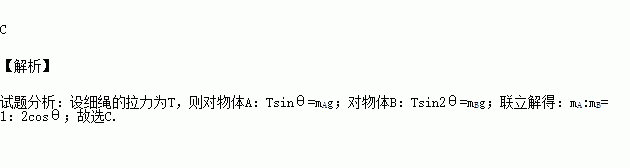 如图所示,开口向下的“┍┑”形框架,两侧竖直杆光滑固定,上面水平横杆中点固定一定滑轮,两侧杆上套着的两滑块用轻绳绕过定滑轮相连,并处于静止状态,此时连接滑块A的绳与水平方向夹角为θ,连接滑块B的绳与水平方向的夹角为2θ,则A、B两滑块的质量之比为( )