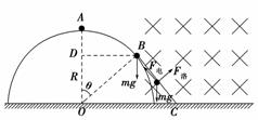 如图物-11所示,半径为R的半圆型光滑绝缘轨道固定在水平面上,一带电量为+q,质量为m的小球以极微小的速度从轨道最高点A释放,恰在B点进入有界电场和磁场的复合场(电场未画出),并能沿直线运动到地面上的C点。(重力加速度为g)求: