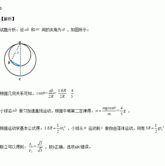 如图所示,在竖直平面内有半径为R和1.5R的两个圆,两圆的最高点相切,切点为a,b和c分别是小圆和大圆上的两个点,其中ab长为1.6R,ac长为3R。现沿ab和ac建立两条光滑轨道,自a处由静止释放小球,已知小球沿ab轨道运动到b点所用时间为t1,沿ac轨道运动到c点所用时间为t2,则t1与t2之比为