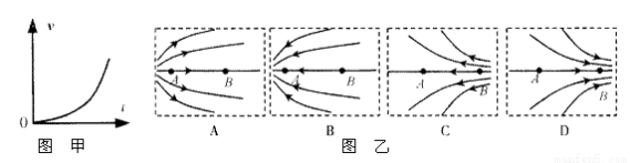 一电荷从电场中A点由静止释放,只受电场力作用,沿电场线运动到B点,它运动的v-t图象如图甲所示.则A、B两点所在区域的电场线分布情况可能是图乙中的( )