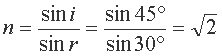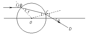 如图,MN是一条通过透明球体球心的直线。在真空中波长为λ0=564 nm的单色细光束AB平行于MN的射向球体,B为入射点, 若出射光线CD与MN的交点P到球心O的距离是球半径的 倍,且与MN所成的角α=30°,求:此单色光在透明球体中的波长和透明体折射率。