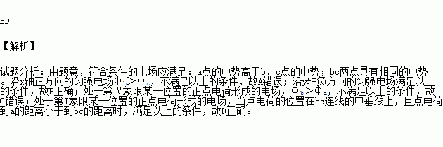 如图所示,xoy坐标系中,将一负检验电荷Q由y轴上a点移至x轴上b点时,需克服电场力做功W;若将该检验电荷从a点移至x轴上的c点时,也需克服电场力做功W。那么关于此空间的静电场的说法,正确的是