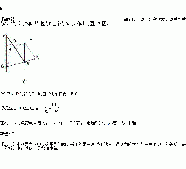 如图所示,竖直绝缘墙壁上的Q处有一固定的质点A,在Q正上方的P点用绝缘丝线悬挂另一质点B,A、B两质点因为带电而相互排斥,使悬线与竖直方向成θ角,现通过某种方法使A、B的带电荷量均变为原来的两倍,则悬线对悬点P的拉力大小将( )