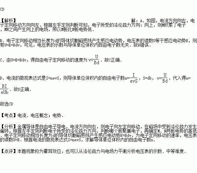如图所示,一块长度为a、宽度为b、厚度为d的金属导体,当加有与侧面垂直的匀强磁场B,且通以图示方向的电流I时,用电压表测得导体上、下表面MN间电压为U.已知自由电子的电量为e.下列说法中正确的是( )