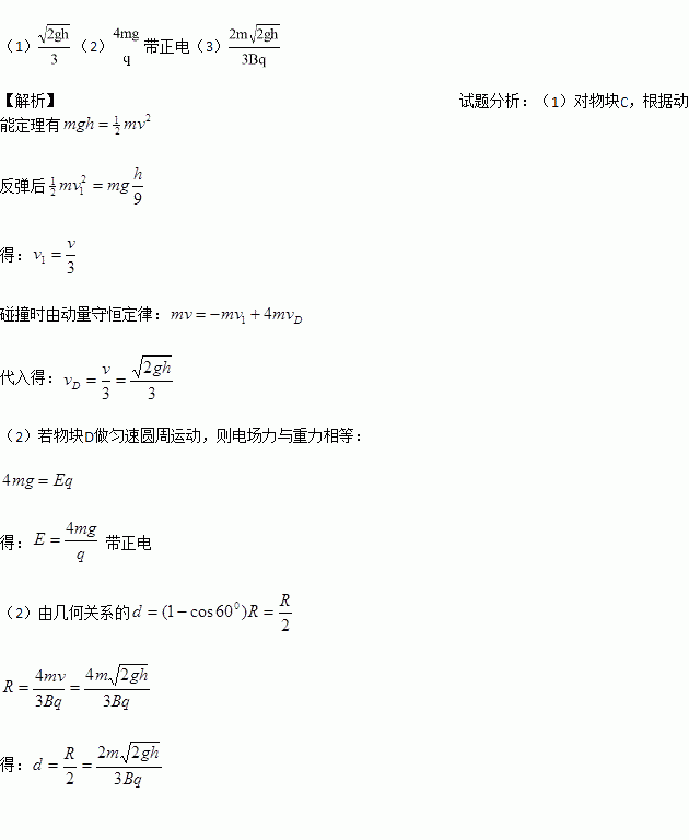 (2)若物块D进入磁场后恰好做匀速圆周运动,求所加匀强电场的电场强度E的值及物块D的电性;